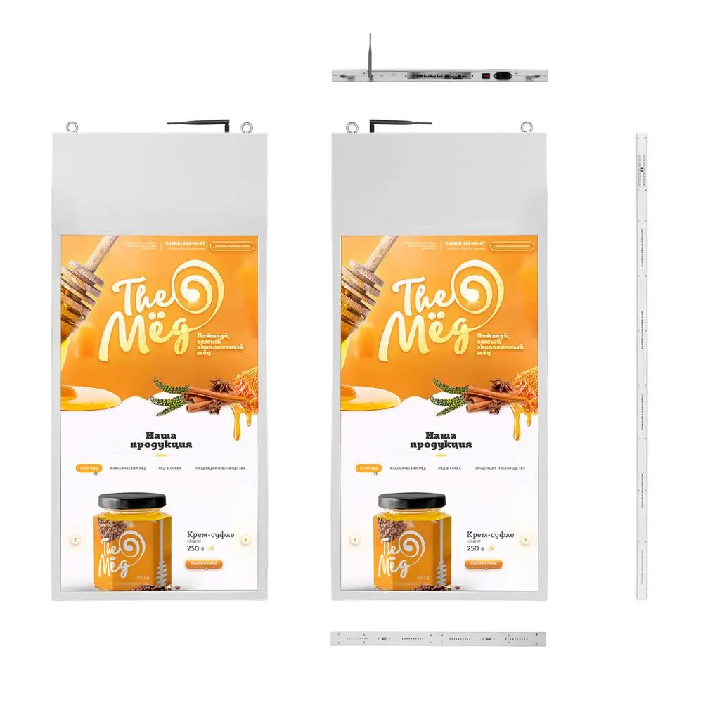 Size 49inch Dimensions 1416.7 × 654 × 33 mm Active Area 1074.7(H) × 605(V)mm OS Android 6.0/ 7.1 RAM 1G DDR3 (2G/4G for optional) ROM 8G EMMC (8G/16G/32G/64G EMMC for optional) Resolution 1920*1080 Form Double-Sided display Brightness 300cd/㎡ & 700cd/㎡ Interfaces 1*USB, 1*DC, 1*HDMI Out, 1*RJ45, 1*TF card Viewing Angles 178°(H) × 178°(V) Intetnet WIFI/ Ethernet Storage Environment Temperature:-10℃~60℃